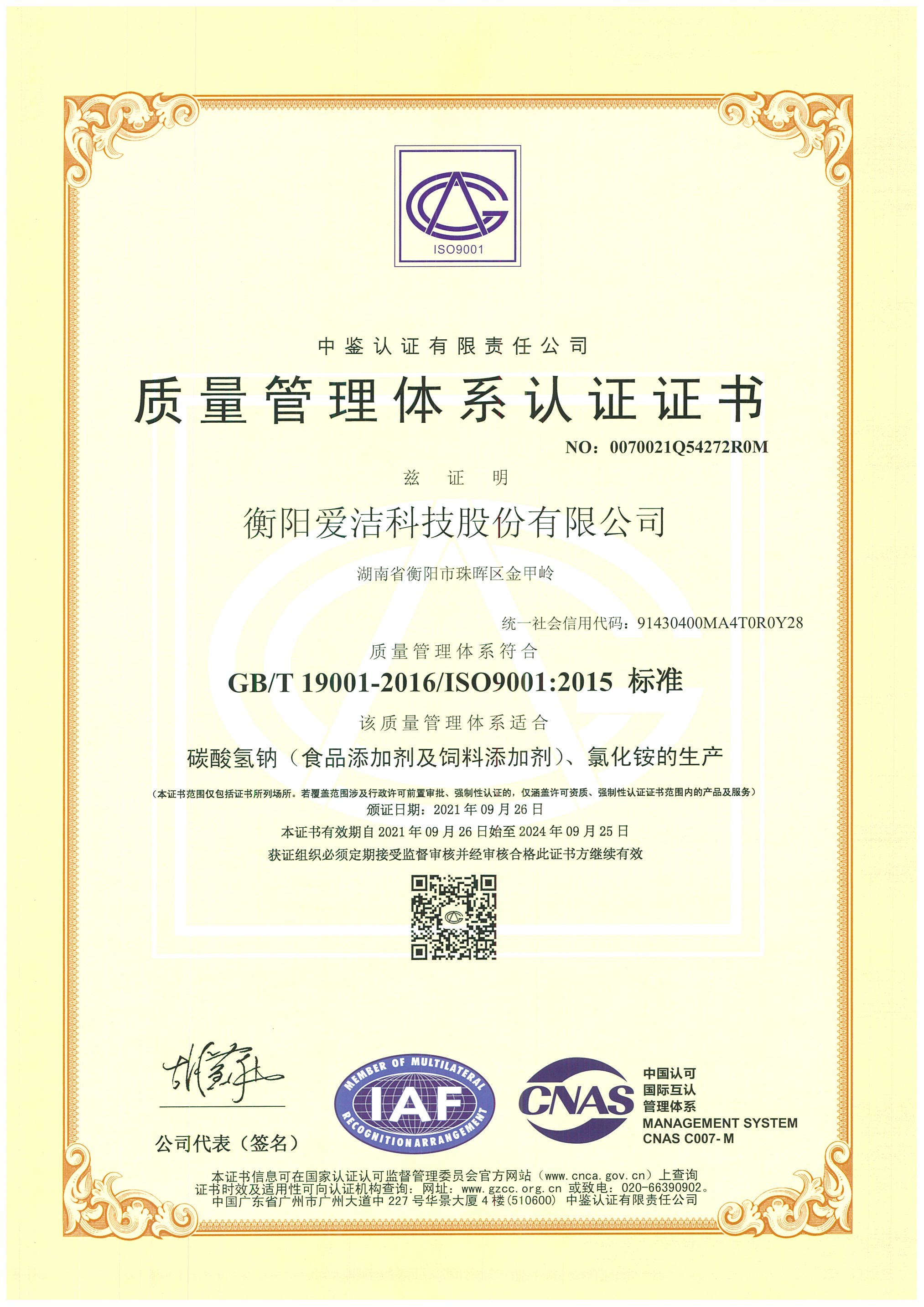 質量管理體系認證證書