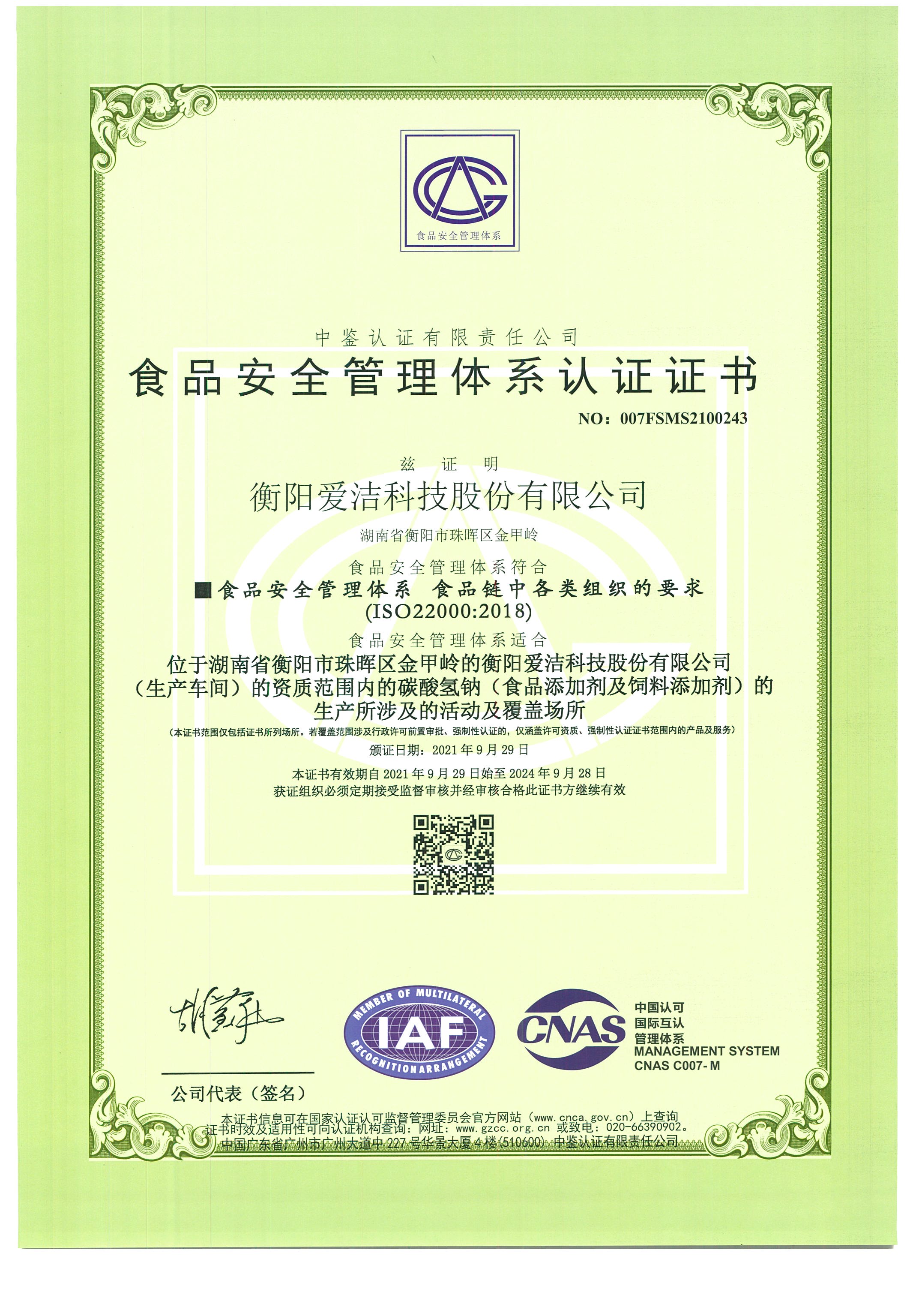 食品安全管理體系認證證書